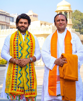 Jay Thadeshwar posing with Pujya Apurvamuni Swami, a motivational speaker and esteemed spiritual leader of BAPS Swaminarayan Sanstha, in a spiritual setting.